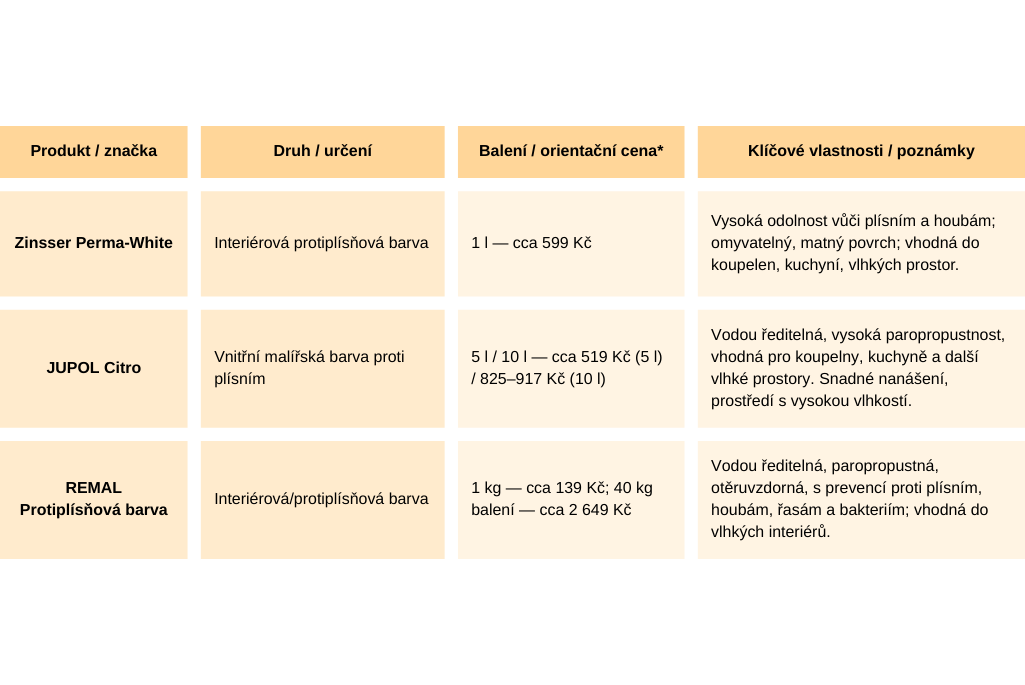 Zde jsou některé oblíbené varianty protiplísňových barev dostupných v České republice: